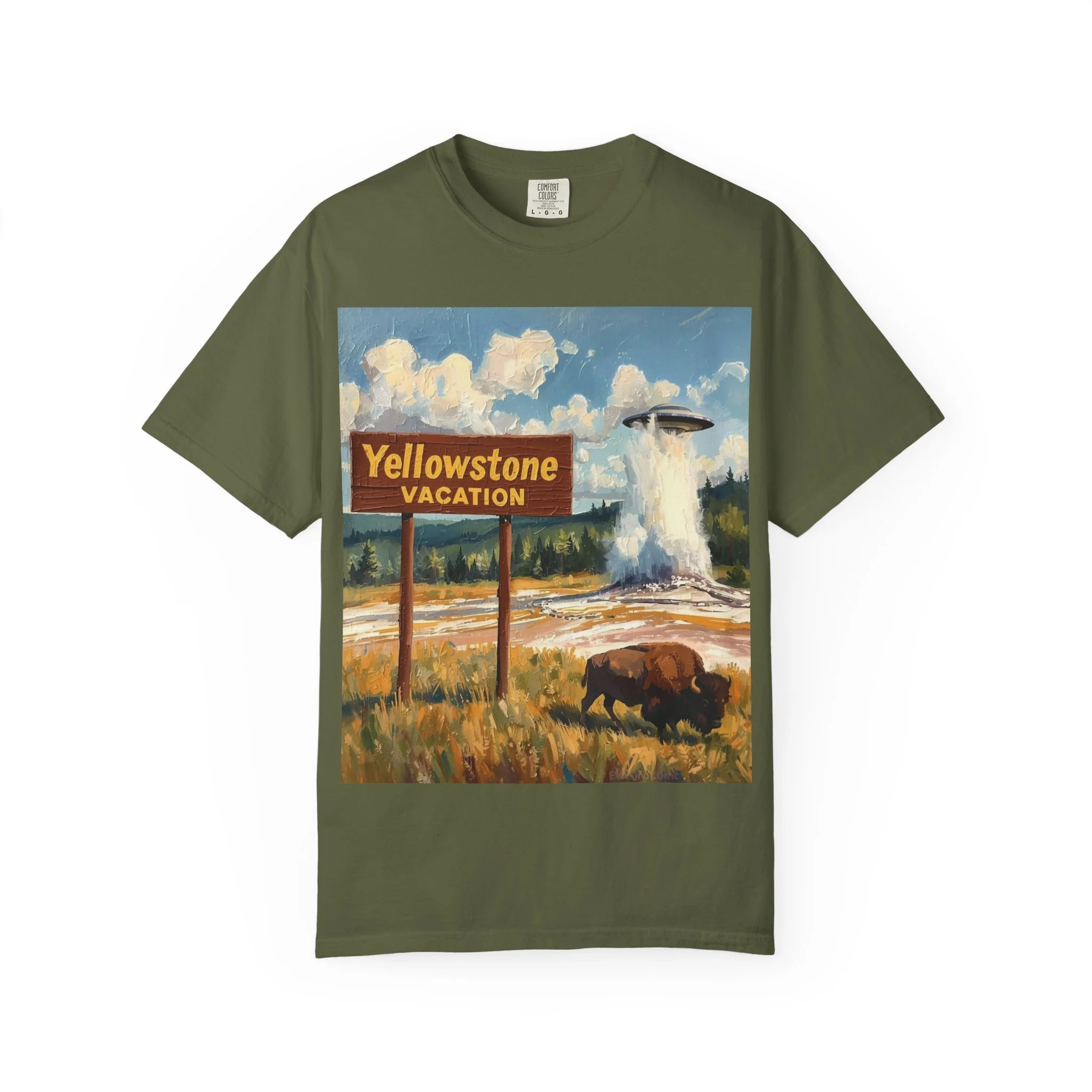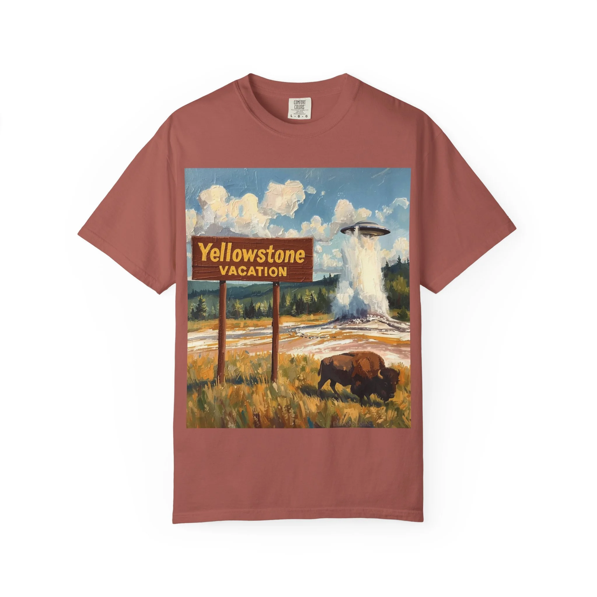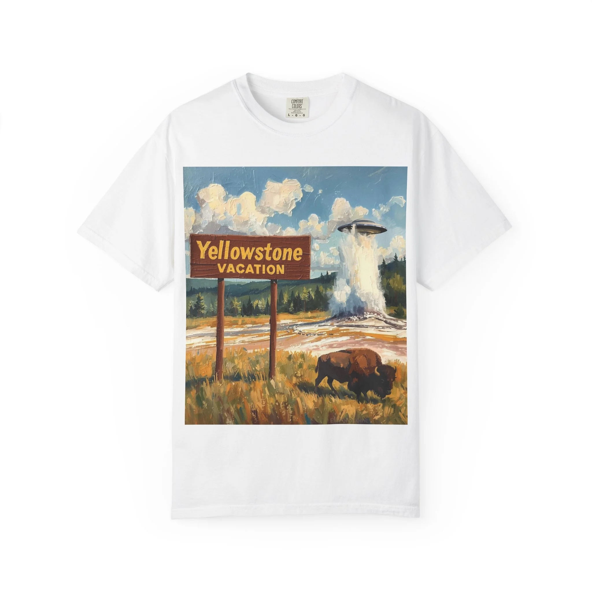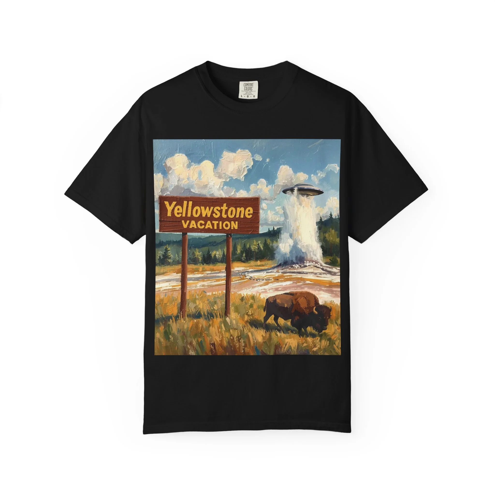 Yellowstone Vacation T-Shirt — Vintage Geyser & Bison Oil Painting Design