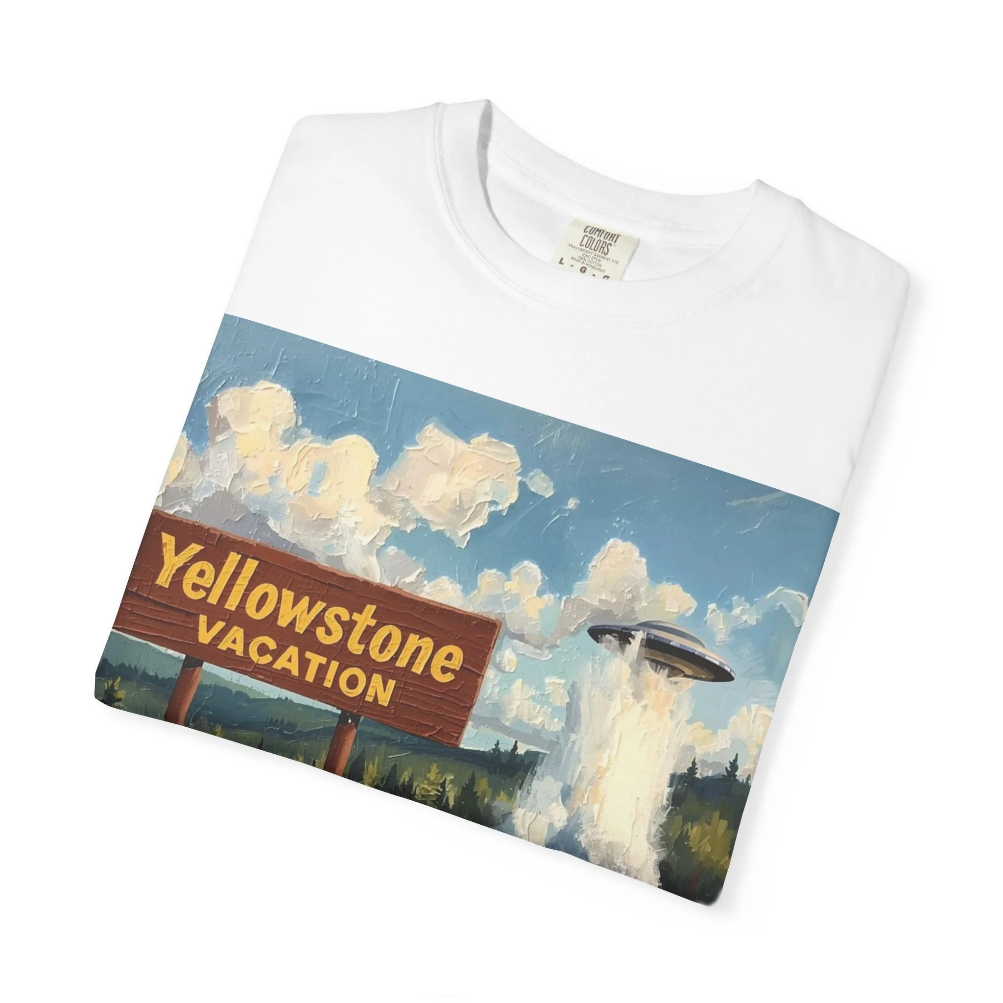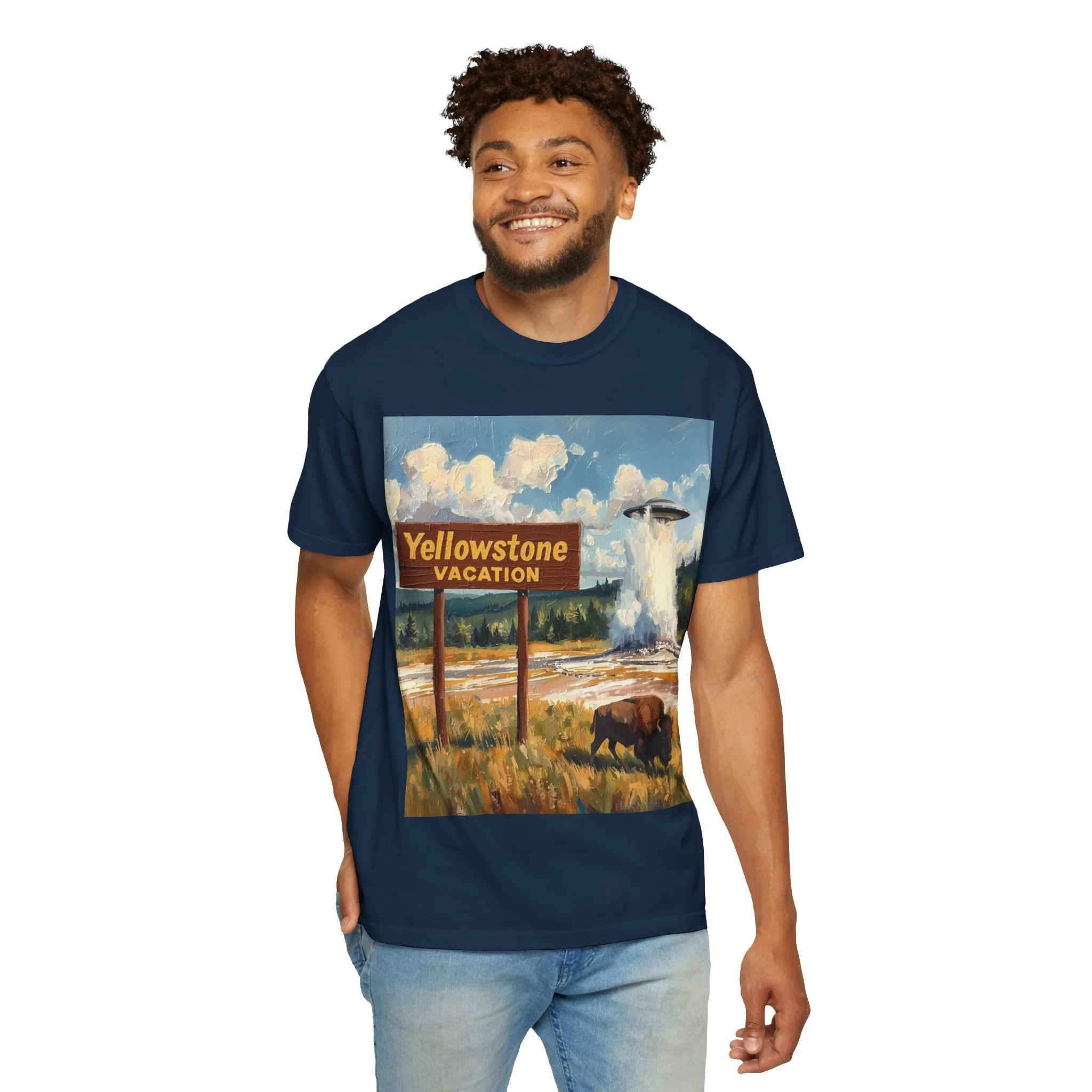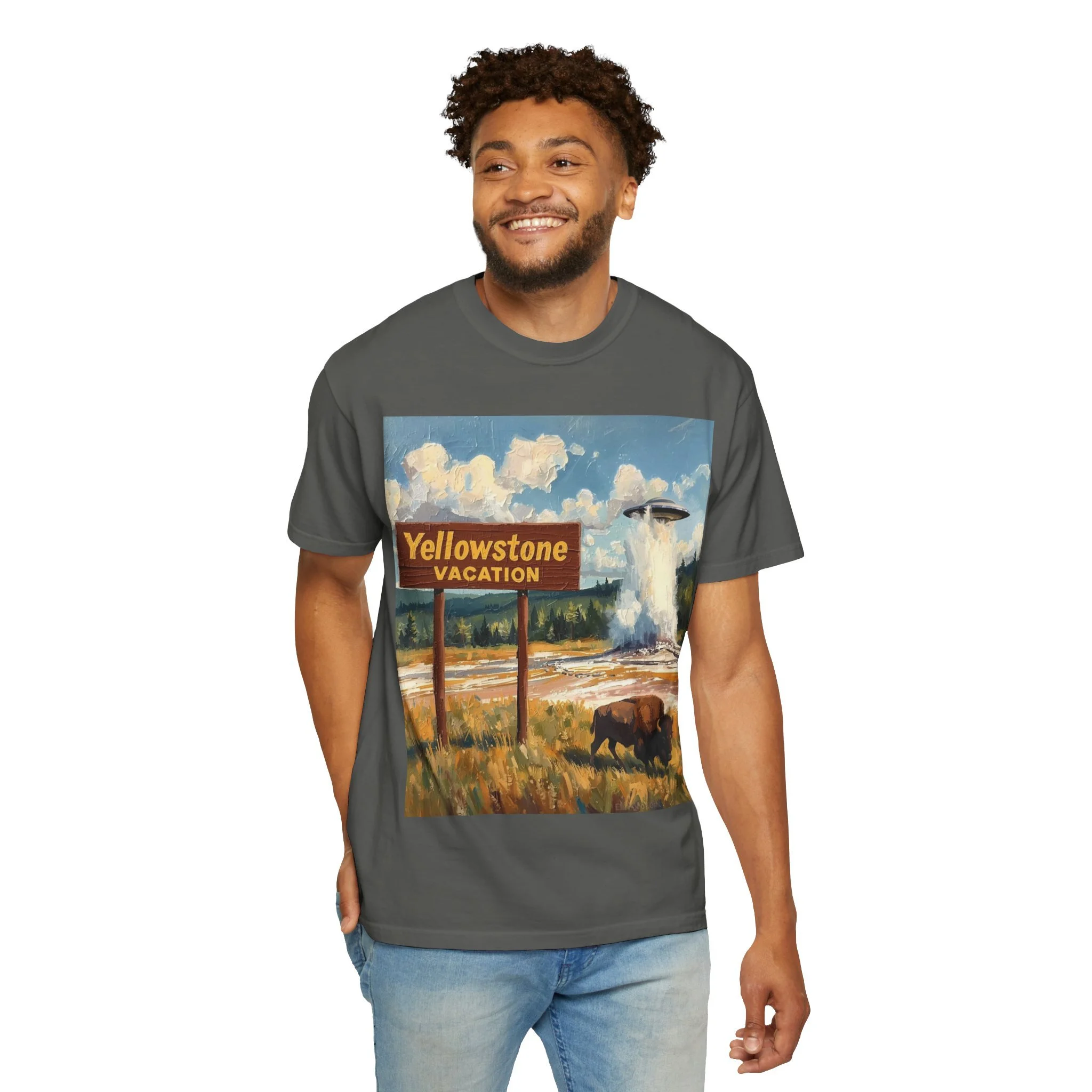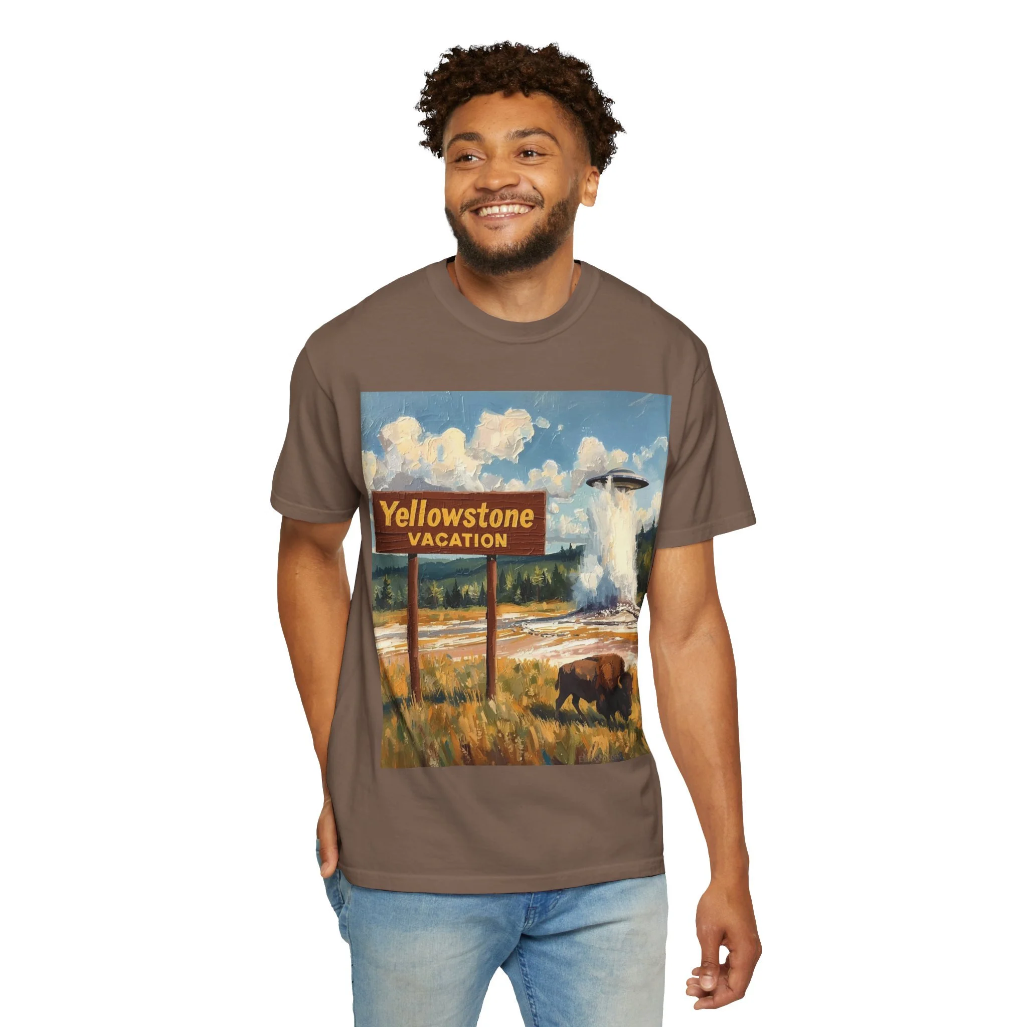Yellowstone Vacation T-Shirt — Vintage Geyser & Bison Oil Painting Design
