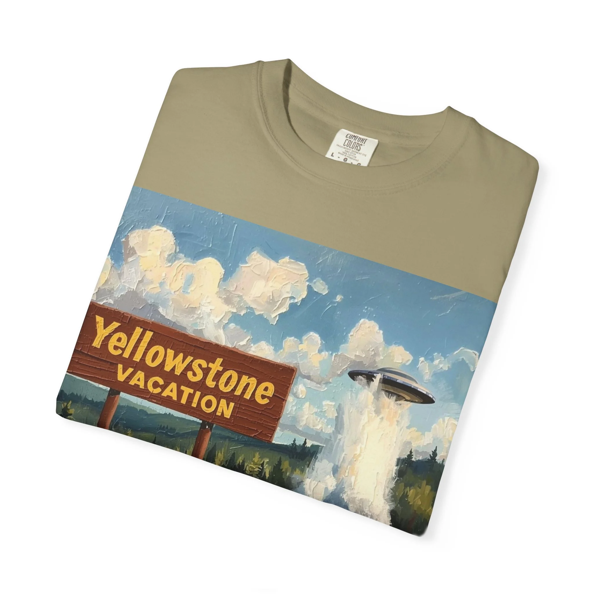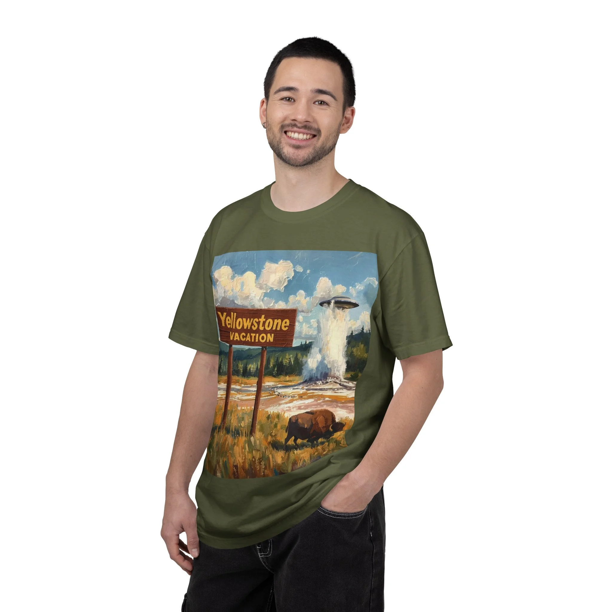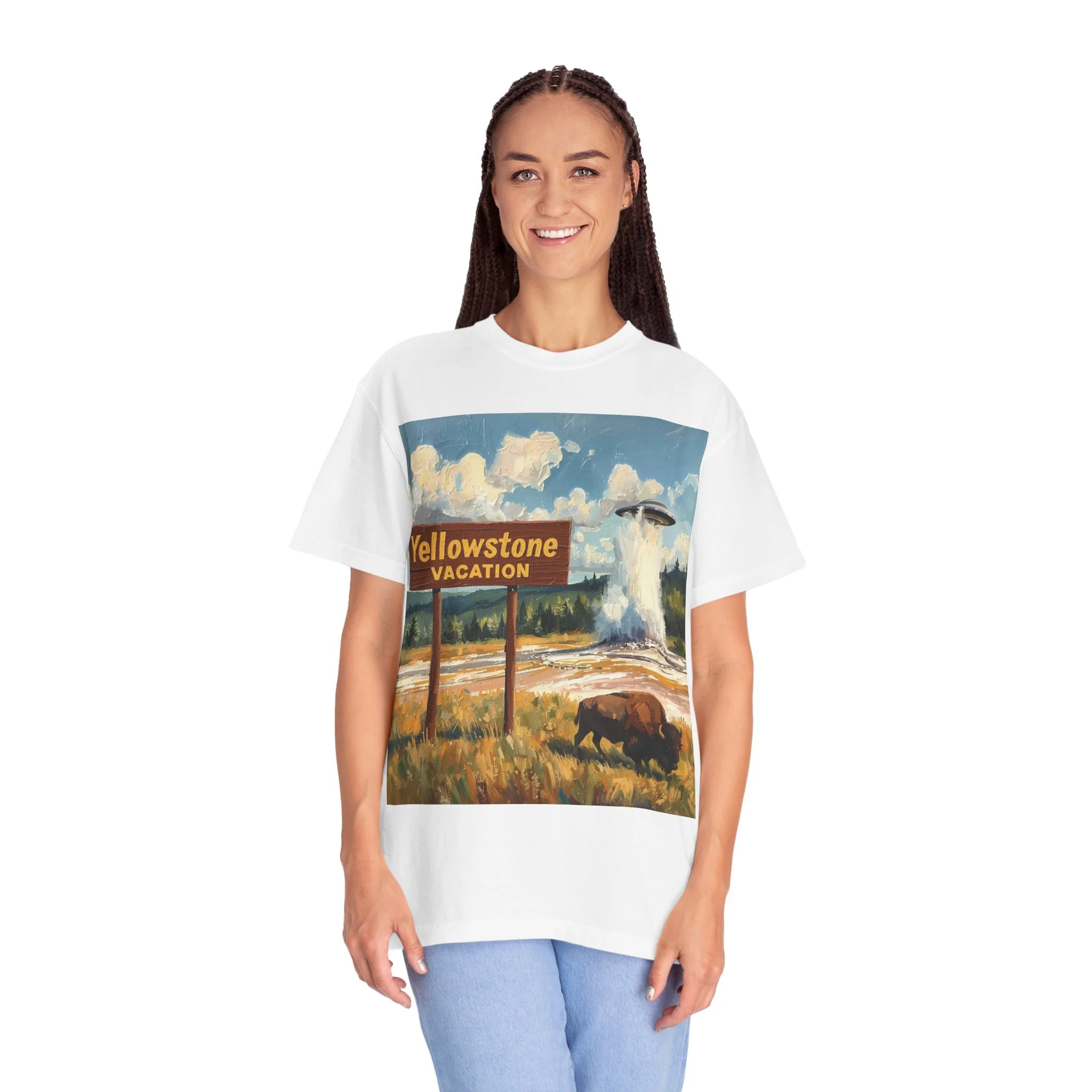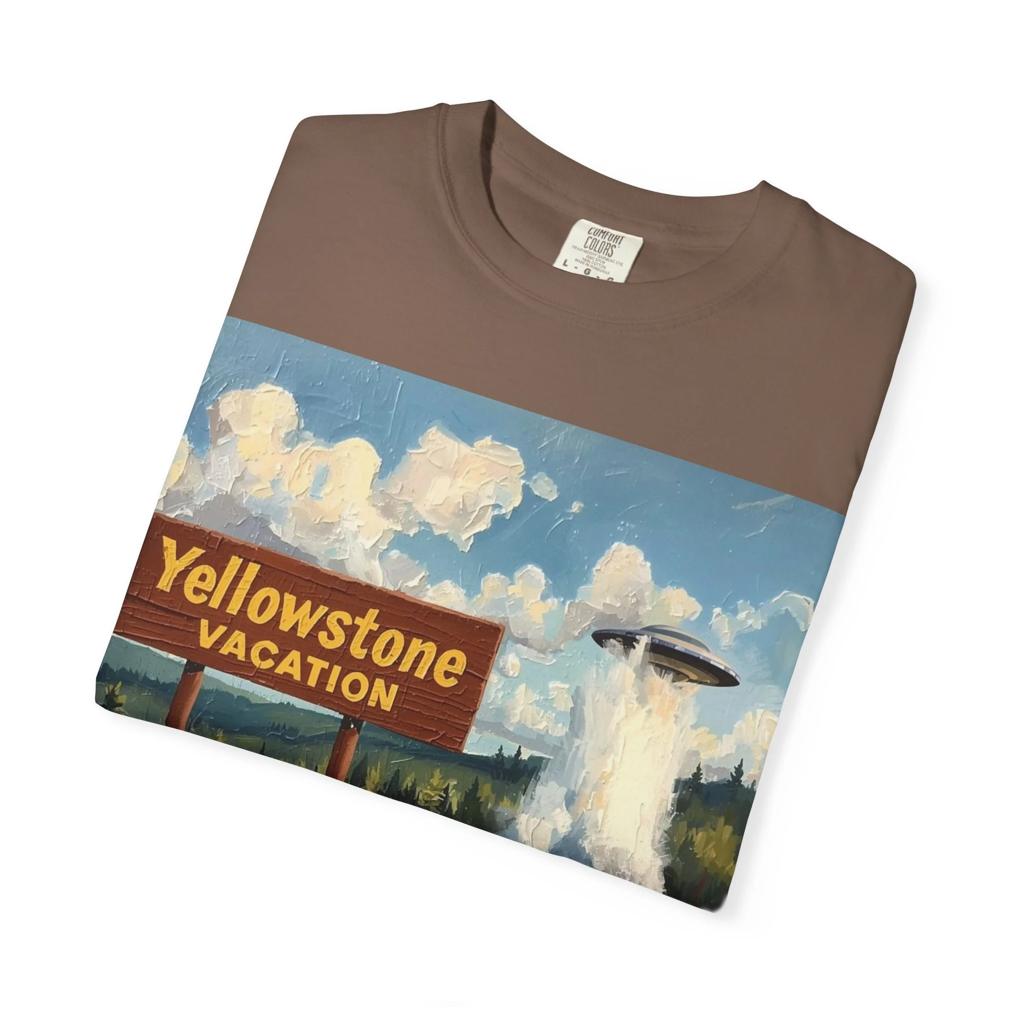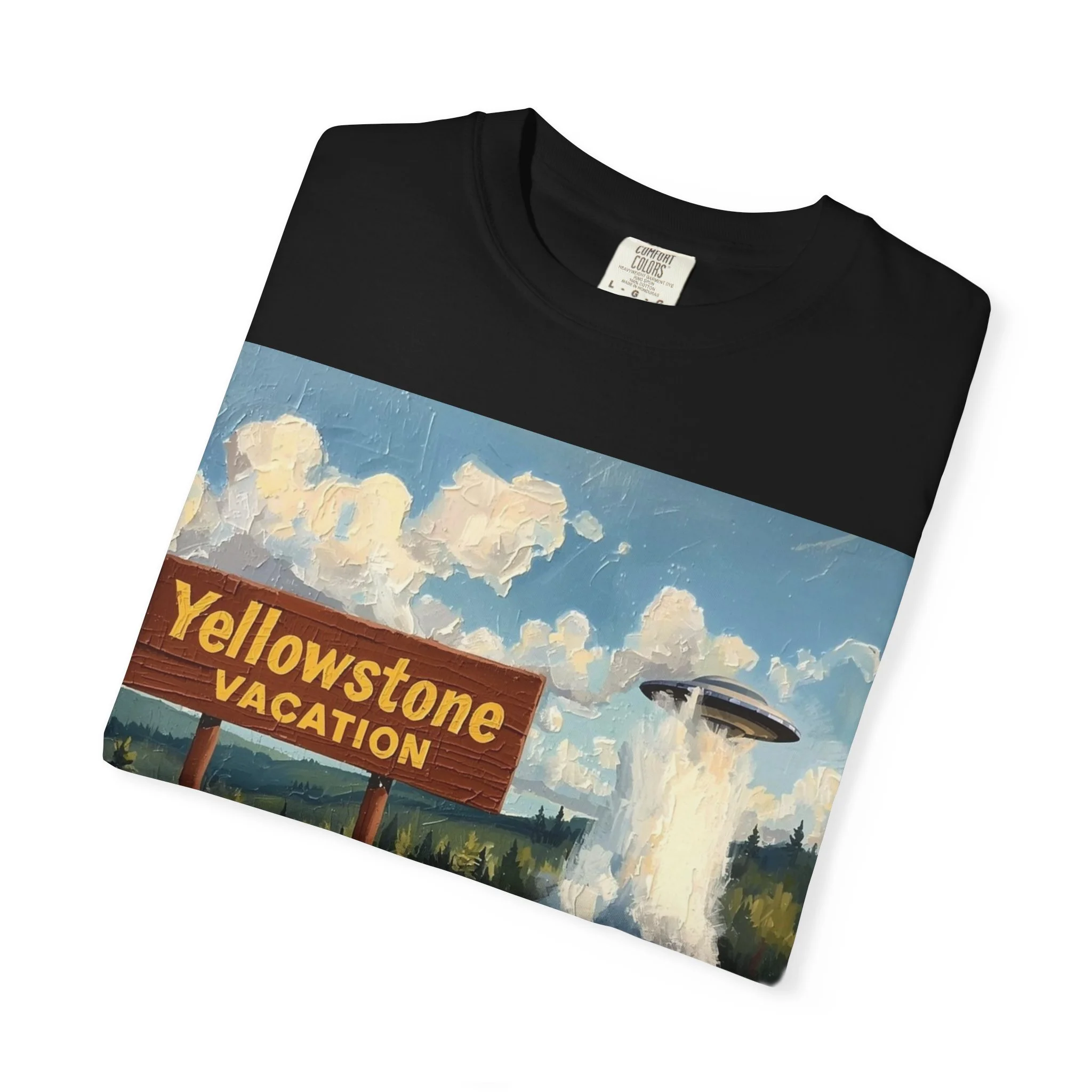 Yellowstone Vacation T-Shirt — Vintage Geyser & Bison Oil Painting Design