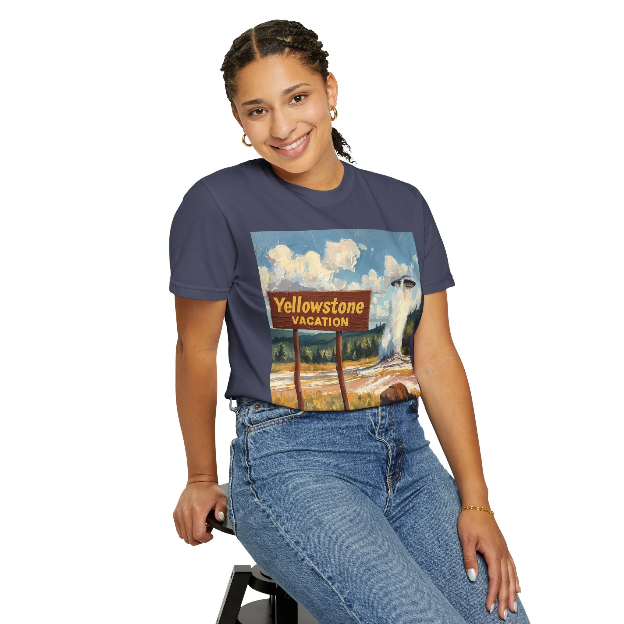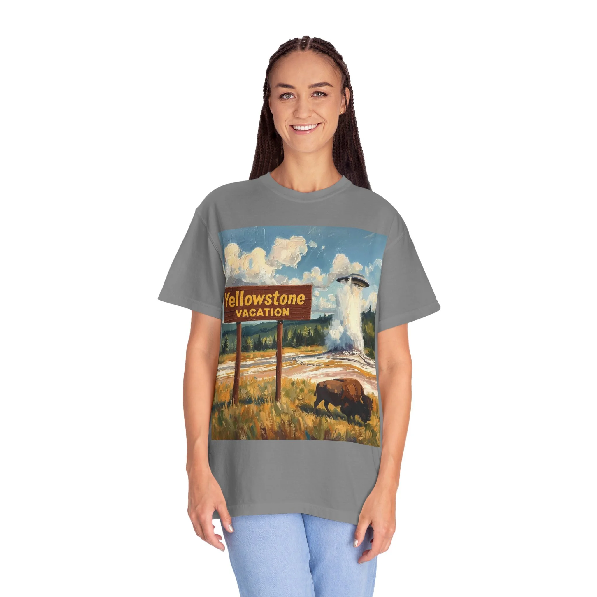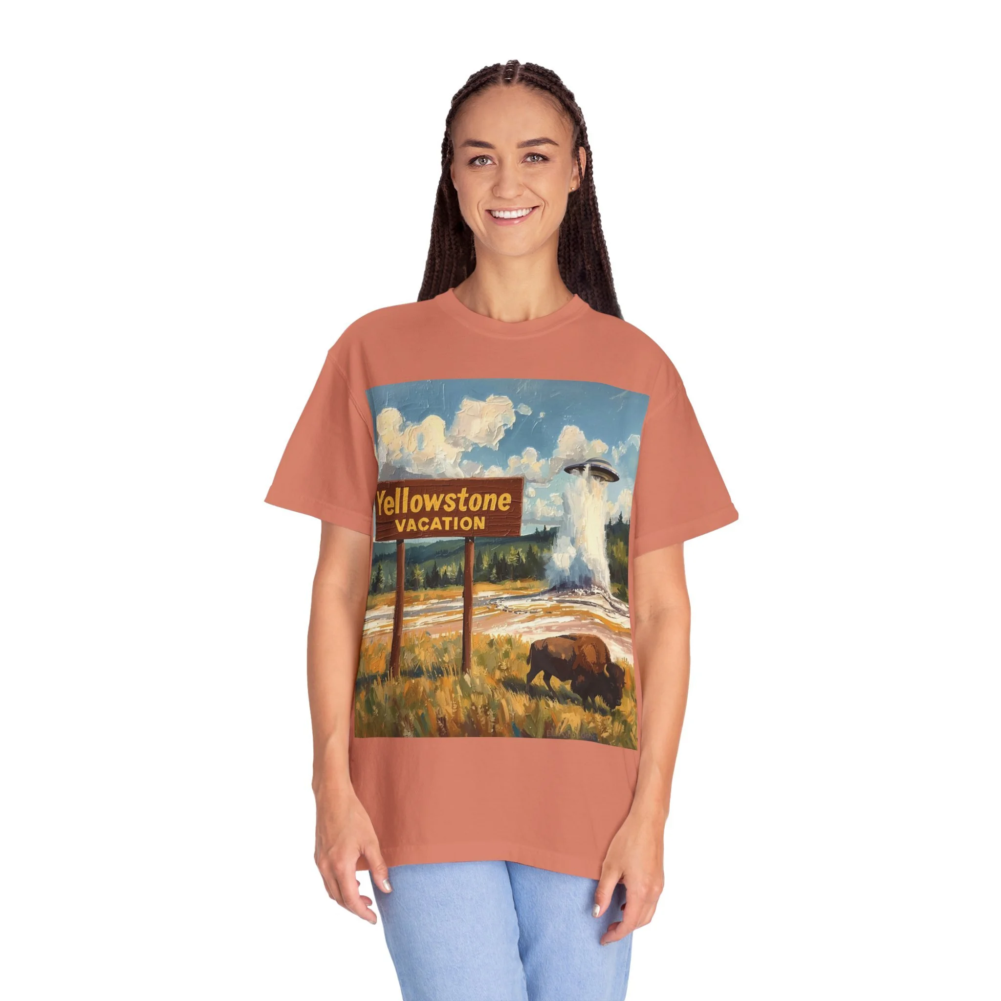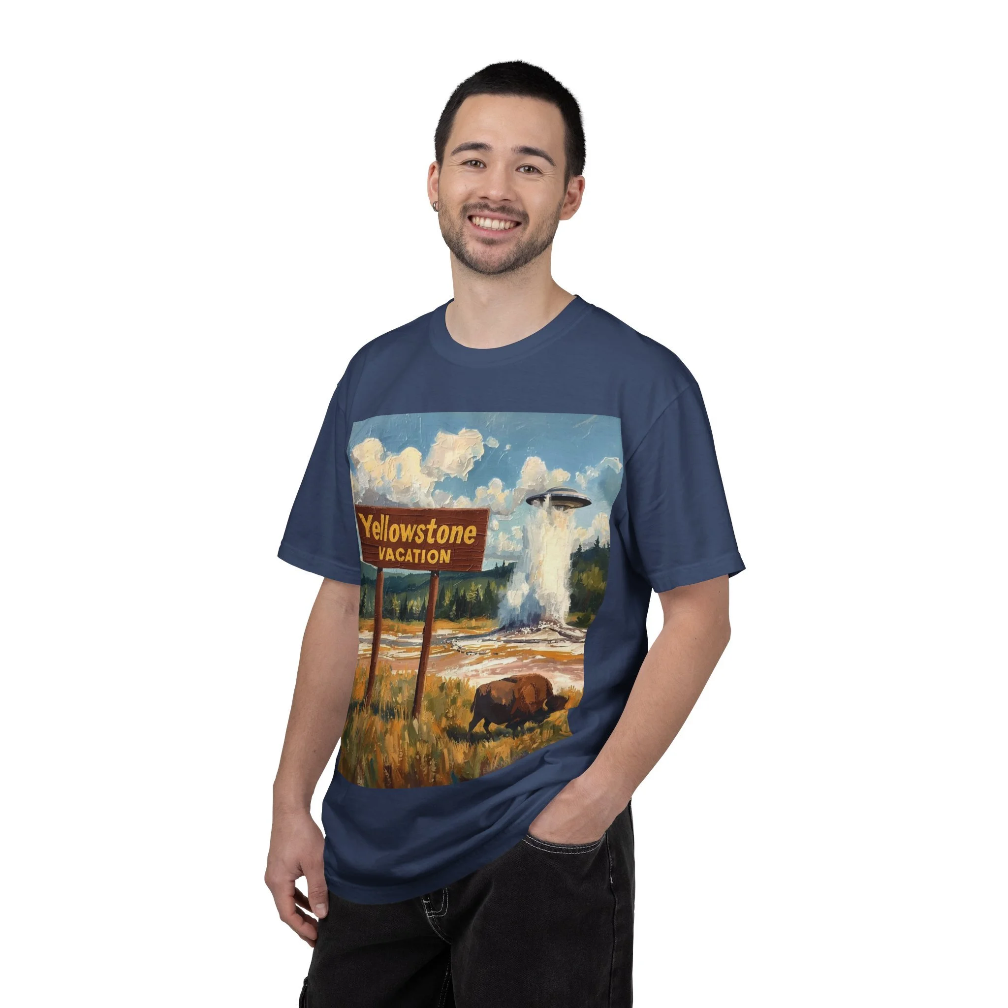 Yellowstone Vacation T-Shirt — Vintage Geyser & Bison Oil Painting Design